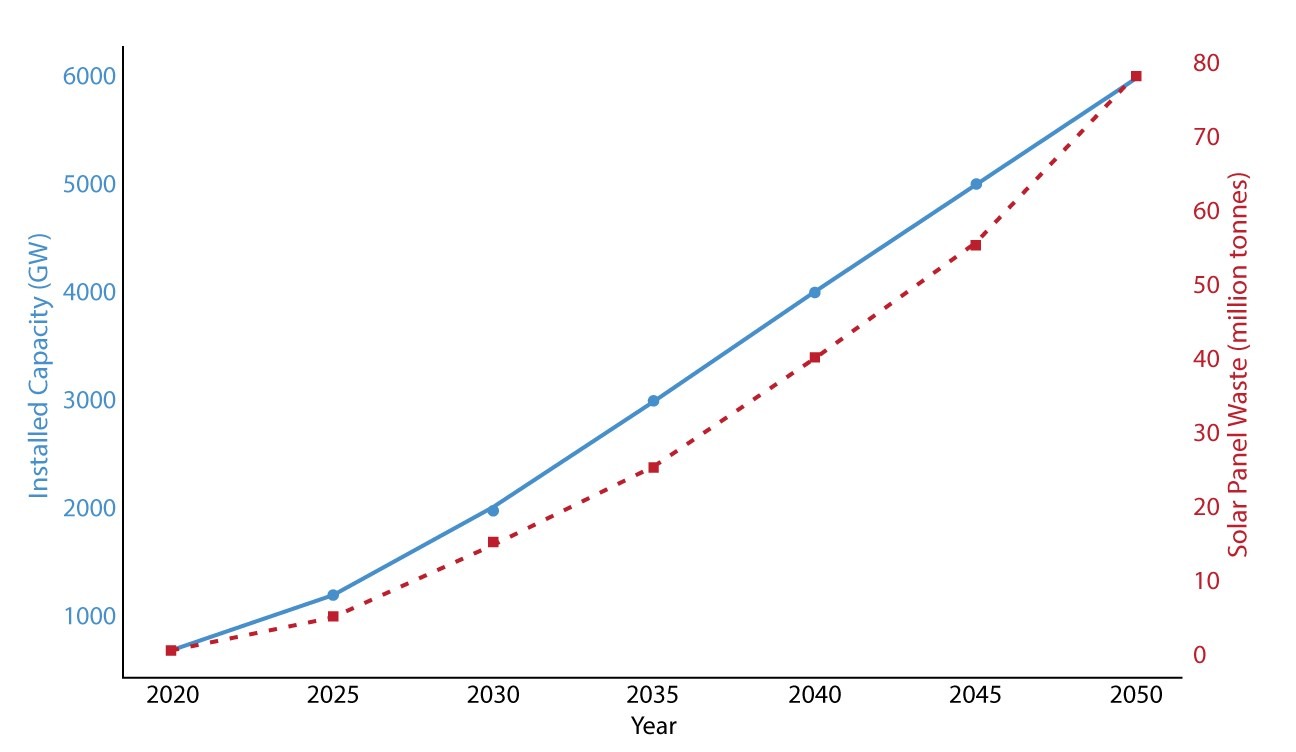 Projected global solar panel waste to 2050 (in million tonnes), alongside projected installed capacity growth